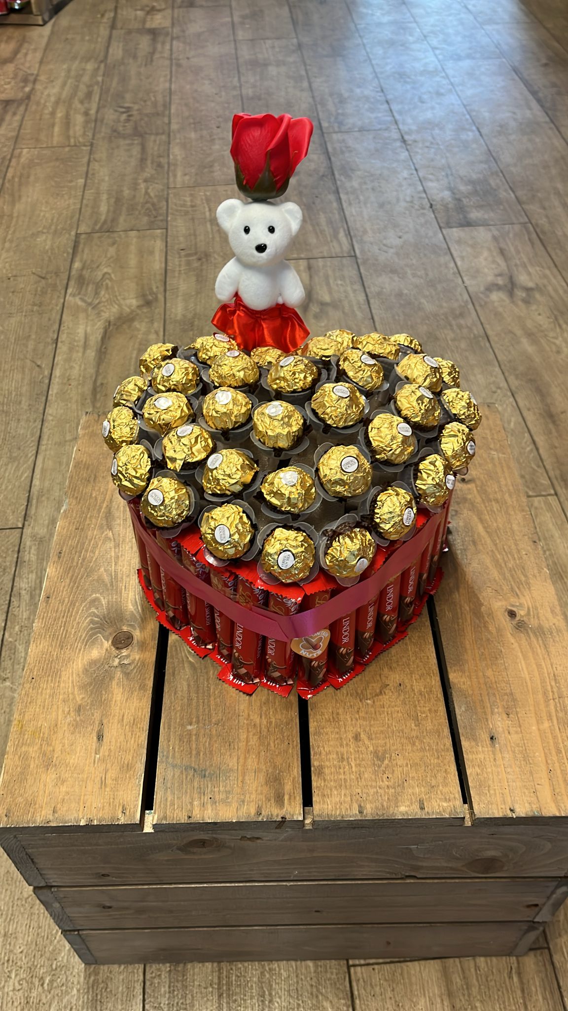 Lindor snd ferro Roche surround heart shaped box with teddy