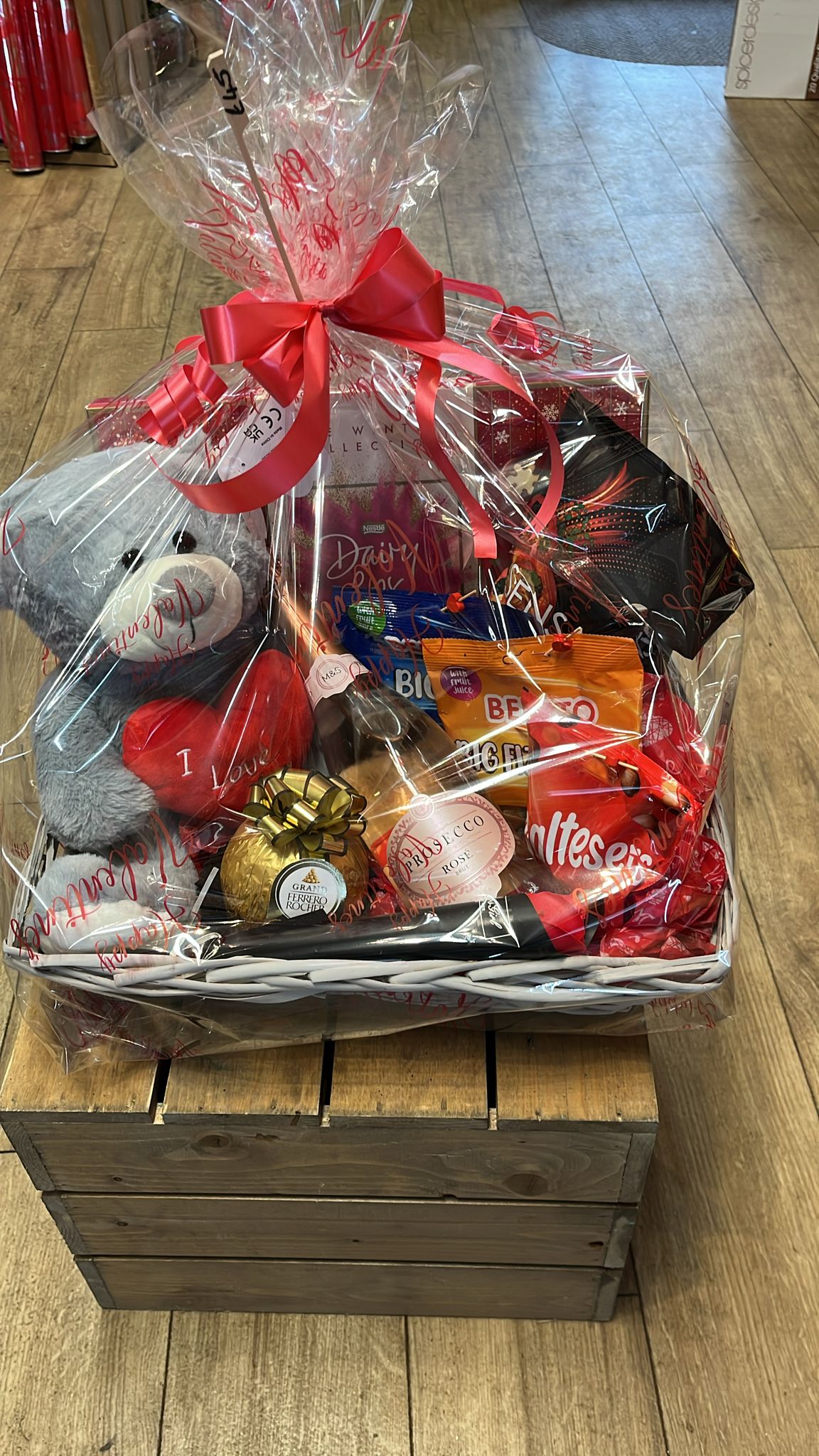 A romantic hamper featuring a bottle of Prosecco, an adorable “I Love You” teddy, a selection of crisps, sweets, and indulgent chocolates. Perfect for celebrating love!